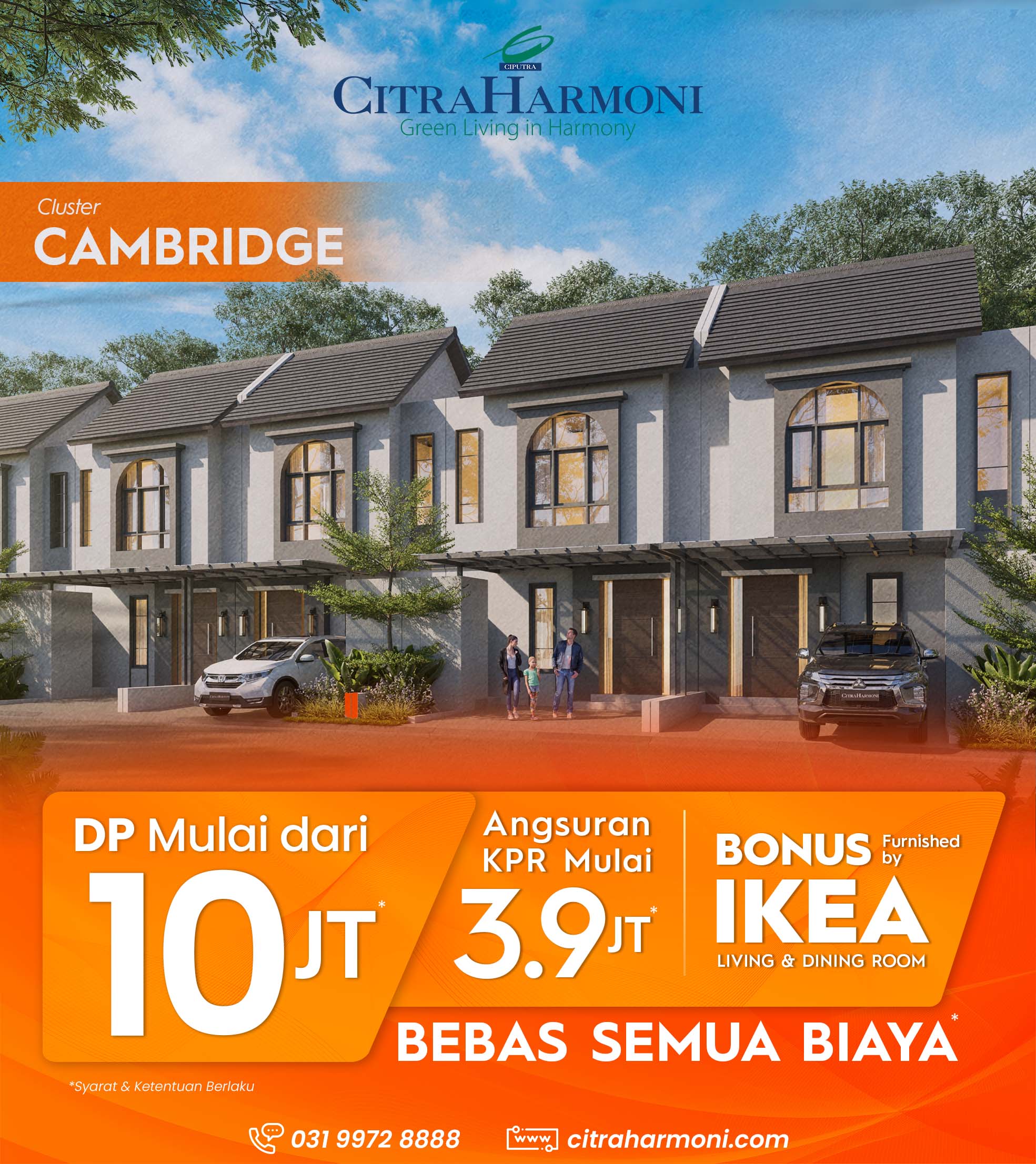 Cukup bayar 10 juta, sudah memiliki rumah 2 lantai dengan Smart Home System di Cluster Cambridge - CitraHarmoni Sidoarjo.